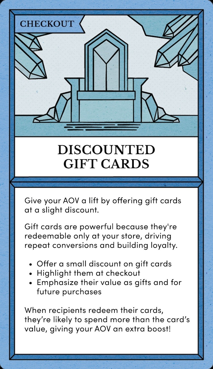 Boost your AOV by offering gift cards at a slight discount. Gift cards are great because they're redeemable only in your store and lead to repeat conversions. Offer a small discount on gift cards Highlight them at checkout Emphasize their value as gifts and for future purchases Encourage customers to buy more and return often with discounted gift cards! -