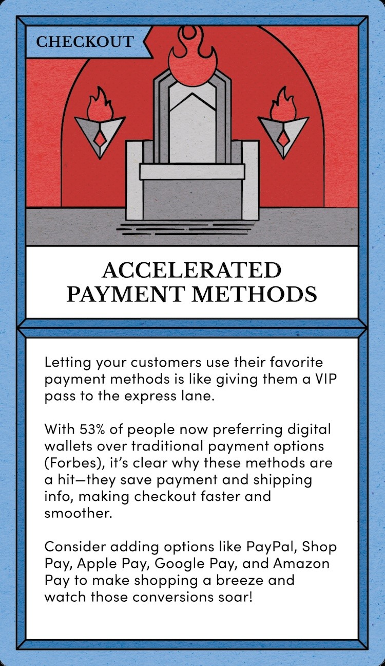 Letting your customers use their favorite payment method is like giving them a VIP pass to the express lane. Accelerated payment methods save customer payment and shipping information, allowing customers to more quickly complete the checkout process when they visit again. Consider offering common accelerated payment methods like, Shop Pay, Apple Pay, Google Pay, and Amazon Pay. -