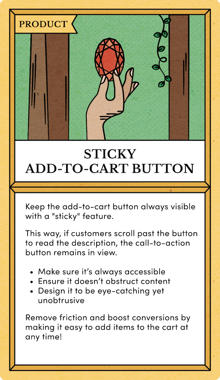Keep the add-to-cart button visible at all times with a "sticky" feature. This way, if customers scroll past the button to read the description, the call-to-action remains in view.